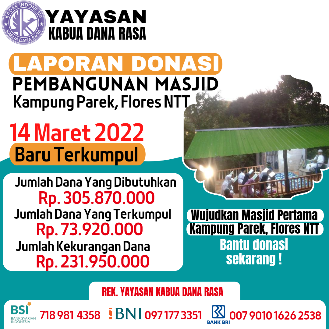 Alhamdulillah Jumlah Dana Wakaf pertanggal 14 Maret 2022 yang sudah masuk melalui Rekening Yayasan Kabua dana Rasa Rp.73.920.000